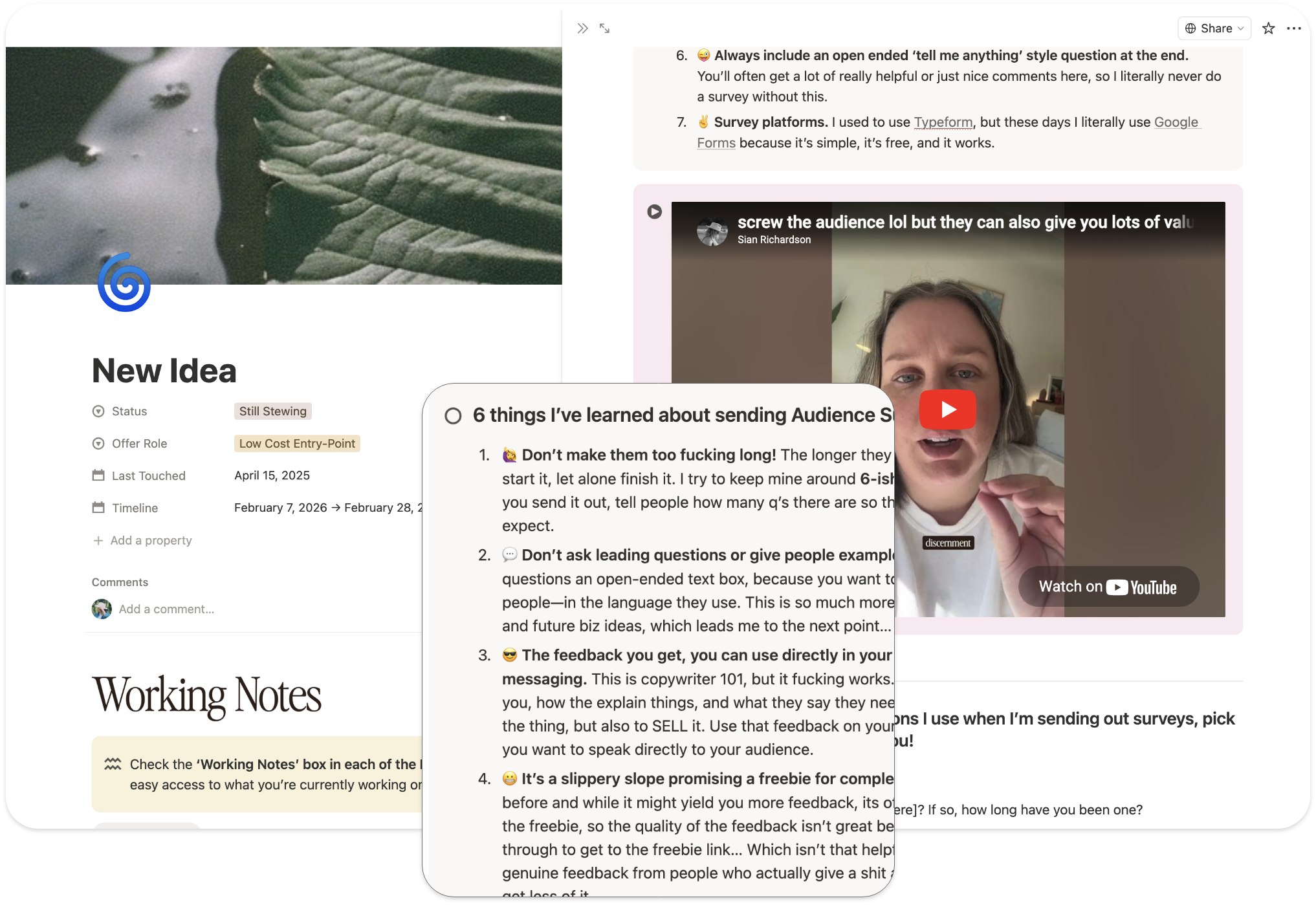 🌲 Deeper explorations: two worksheets that help you understand how you actually operate and what connects everything you create. So you're not just launching random shit into the void, but building a body of work that actually has a thread running through it.