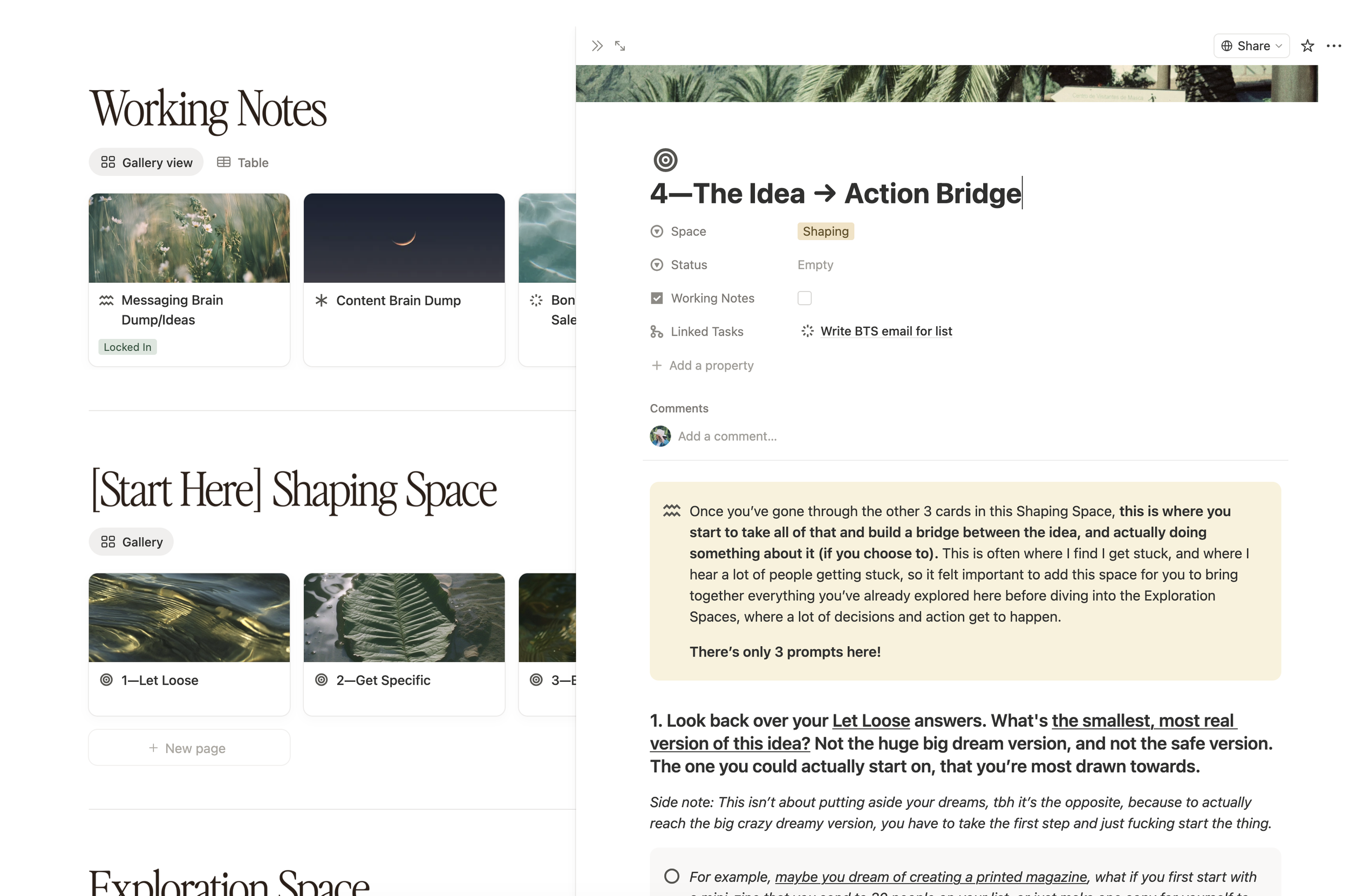 And you get the hands-on practicality of a template (a real working system inside Notion) without the blank-page paralysis of figuring out what to actually put in it.